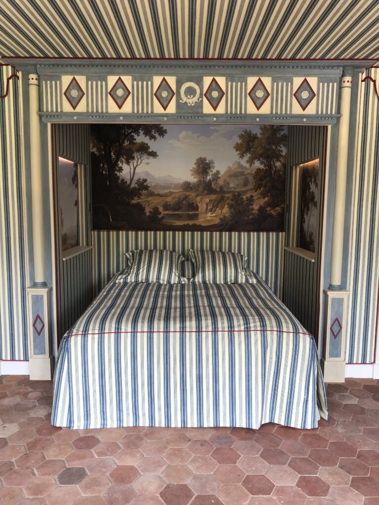 À l’étage « La charpente, la toiture, les chéneaux, tout a été compliqué » notent Emmanuel Basse et Benoît d’Halluin. La chambre de Napoléon a été décorée dans l’esprit « campement » avec un lit en alcôve, des tentures en cotonnade Pierre Frey, un tableau qui rappelle la campagne d’Italie et un mobilier empire. Un passage discret mène à la chambre de Marie-Louise, seconde épouse de l’empereur. Une chambre forestière et d’autres « d’appoint » complètent le tout. Total des couchages : 20.