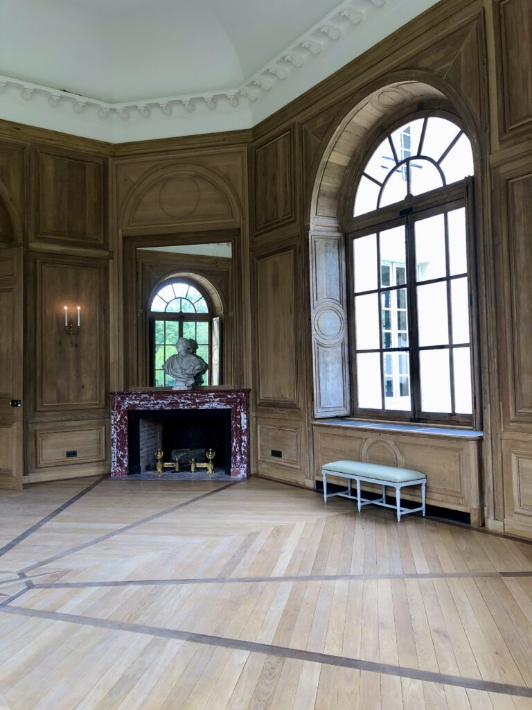 « Le Pavillon de chasse, achevé en 1775, a été surnommé le Petit Trianon de Maisons-Laffitte » rappelle Emmanuel Basse l’un des propriétaires. « Il a les mêmes proportions : une façade de 23 mètres ainsi que 5 portes-fenêtres surmontées de 5 fenêtres carrés ». Les boiseries ont été réalisées par les ateliers Guesnon et Clicquot, artisans ébénistes du Petit Trianon.