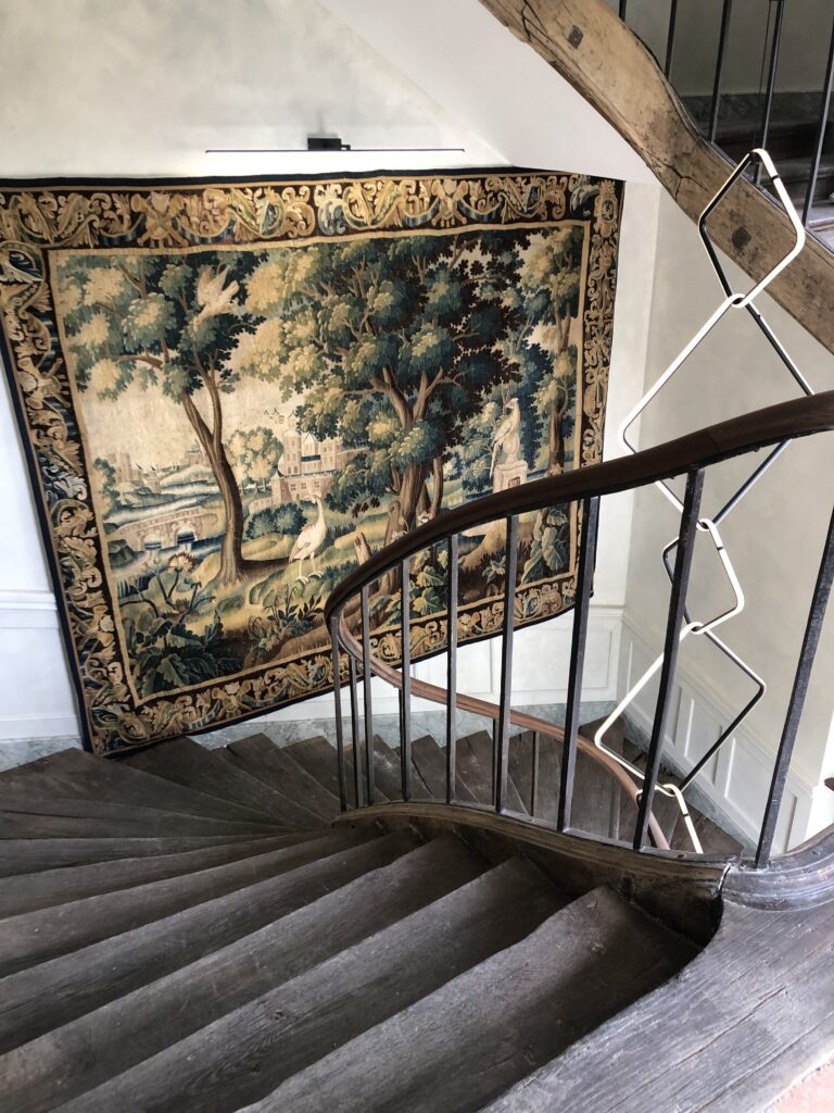 Tapisserie et luminaires design ornent les murs l’escalier.