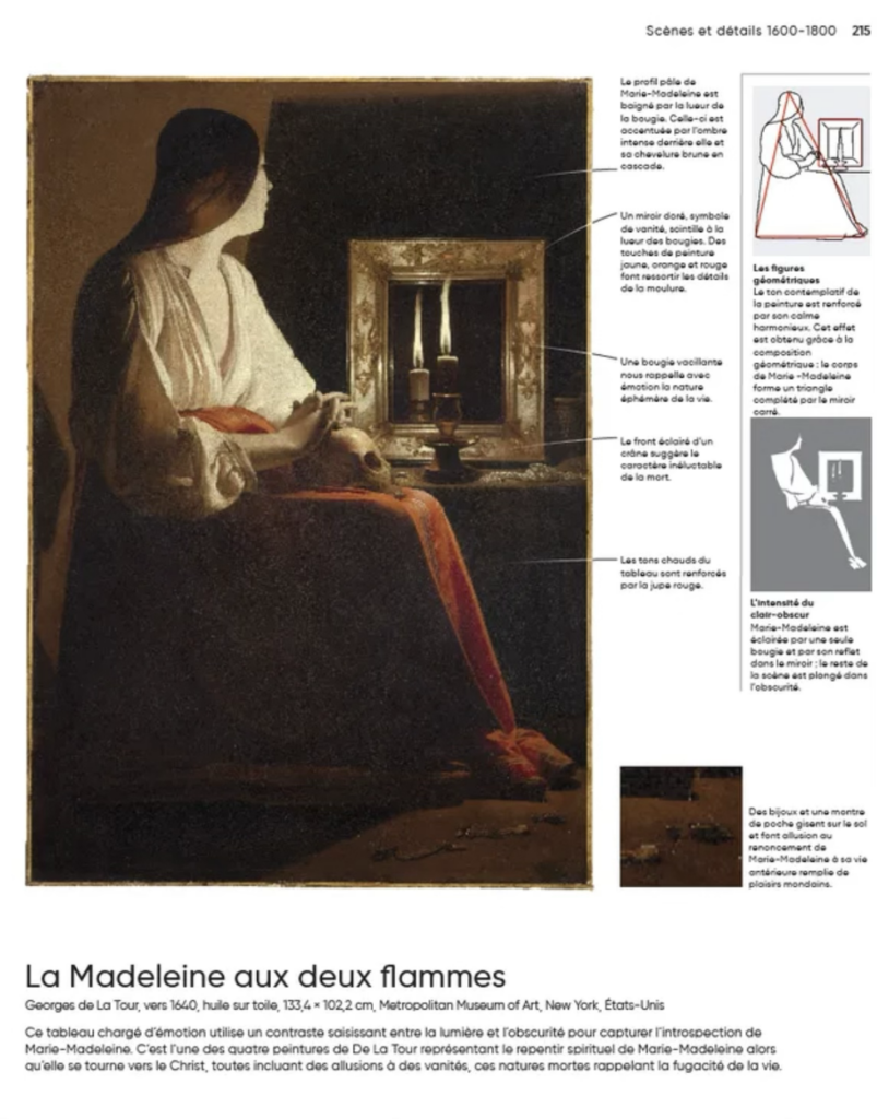 L’idée est simple : prendre 500 tableaux célèbres, les reproduire en grand format et zoomer sur un détail significatif (un pli de drapé, une goutte de sang, une tache de lumière). Chaque double page propose un court texte explicatif, une légende technique et une flèche qui pointe le « secret » du détail.