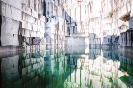 Roman Robroek livre des photos saisissantes. Dans un hôtel allemand, un tapis de fougère vert sombre joue avec les pieds d’une table et d’un fauteuil défoncé ainsi qu’avec la lumière qui perce la pénombre égayée par deux morceaux de tissus orange. La nature en reconquête a composé un tableau. Plus loin, en Italie, dans un atelier d’artiste on croit voir un fantôme sortir d’une fenêtre pour regarder une toile. Toujours en Italie, une trottinette hante le couloir d’un ancien asile psychiatrique. Et toujours improbable, l’ancienne carrière de marbre transformé en « bassin aux reflets sublimes ». C’est bien un monde de reflets que saisit Roman Robroek.