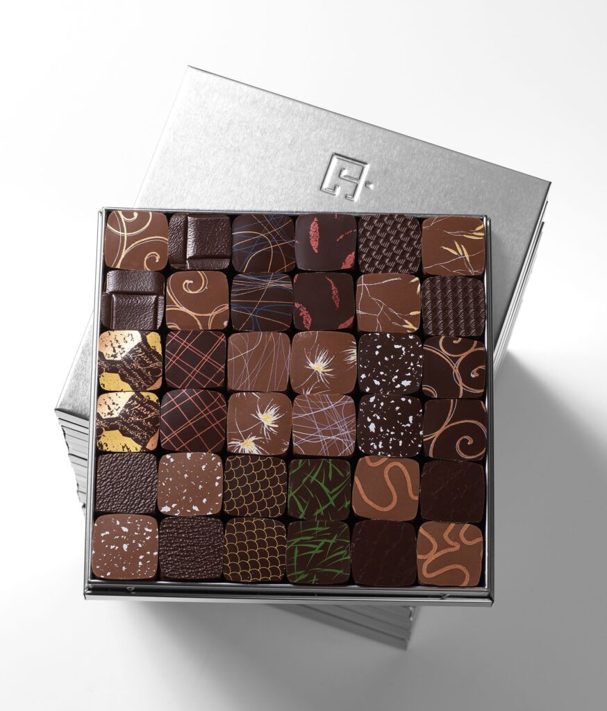 Pierre Hermé s’y consacre totalement. Ses créations « Infiniment Chocolat » explorent les thèmes abyssaux (corails, océan) avec des ganaches innovantes, truffes et coffrets festifs.