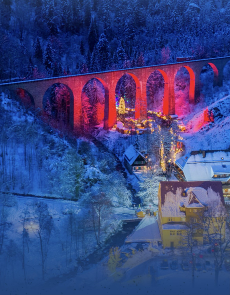 Un marché enchanté dans une gorge sauvage, sous un viaduc illuminé de 40 m. Un régal avec chalets glow dans la neige, sapins noirs et lumières mystiques.