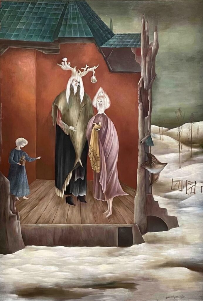 Le voyage n’est donc jamais seulement géographique : il est intérieur, initiatique, astral. La descente dans l’inconscient (Down Below), les « endormissements » actifs, les métamorphoses totémiques ouvrent des portails vers d’autres mondes. Au Mexique, cette quête culmine avec des œuvres majeures intégrant des éléments locaux, comme le grand mural El Mundo Mágico de los Mayas (1963-1964, commandé pour le Musée national d’anthropologie de Mexico) – une fresque cosmogonique maya revisitée par son imaginaire : divinités hybrides, rituels, animaux totémiques et vision féminine du sacré. L’œuvre originale n’est certes pas prêtée. Mais l’’exposition évoque cette dimension mexicaine à travers des peintures, des sculptures, des documents et des amitiés (avec Remedios Varo, Kati Horna). Chez Carrington, le voyage n’est pas fuite, mais outil actif de réinvention permanente : l’artiste devient exploratrice de mondes parallèles, transformant rupture et migration en conquête alchimique.