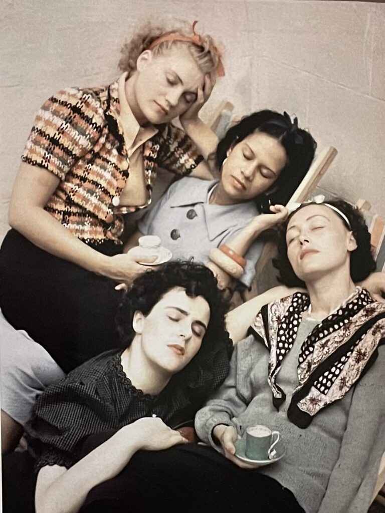 L’artiste partage avec d’autres femmes de l’époque (années 1930-1950) le rejet de l’objectification et l’affirmation d’une voix autonome. L’exposition montre notamment une photo de groupe de Roland Penrose, Quatre femmes endormies. Y figurent : Lee Miller, Leonora Carrington, Ady Fidelin et Nush Eluard. On pense aussi à Dorothea Tanning – compagne d Ernst après Carrington-. La peintre et sculptrice américaine développe un surréalisme plus psychologique, sensuel et gothique (adolescence troublée, sexualité naissante, intérieurs oppressants comme dans Birthday, 1942). De son côté Carrington excelle dans un ésotérisme mythopoétique (alchimie, totems animaux, rituels cosmiques). Ses spécificités : dimension spirituelle initiatique forte, fusion de mythes non-occidentaux, féminisme sorcier radical (la femme comme démiurge), hybridation animale constante – transformant la « folie » en conquête active, là où Dorothea Tanning reste plus introspective et charnelle.