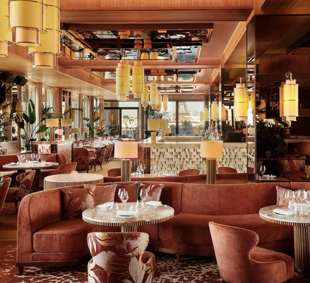 Brunch avec vue sur la Tour Eiffel, décor terracotta moderne, assises confortables et atmosphère raffinée. Touche japonaise fusion : trendy et instagrammable pour un Pâques urbain chic.